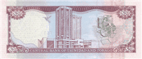 Reverse side of the 20 Trinidad and Tobago dollar is showing Eric Williams Finance Building in Port of Spain where Central Bank of T&T is located and the Steel Pans (steel drums).